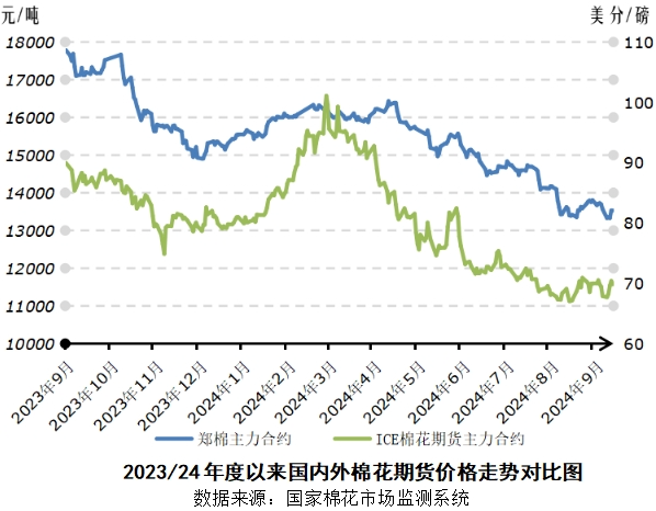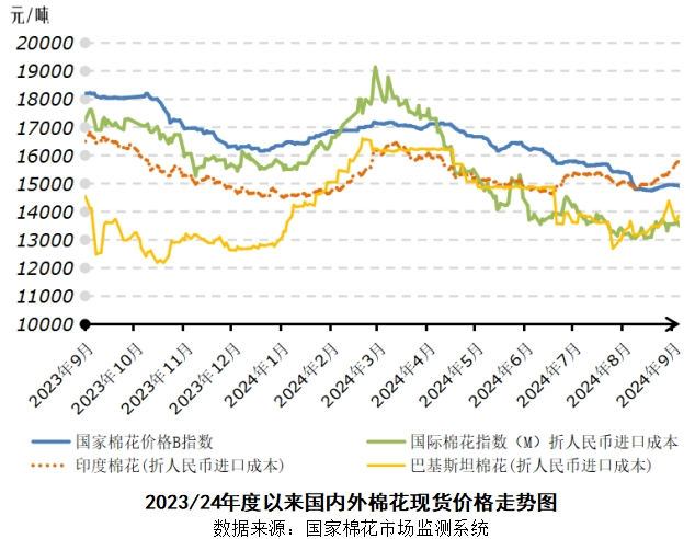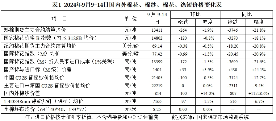 2024年9月9~14日,国内外棉价走势震荡微涨,均价仍低于前周。郑州棉花期货主力合约结算均价13411元/吨,较前周下跌264元/吨,跌幅1.9%;代表内地标准级皮棉市场价格的国家棉花价格B指数均价14802元/吨,较前周下跌120元/吨,跌幅0.8%。纽约棉花期货主力合约结算均价69.14美分/磅,较前周下跌0.38美分/磅,跌幅0.5%;代表进口棉中国主港到岸均价的国际棉花指数(M)均价77.42美分/磅,较前周下跌0.99美分/磅,折人民币进口成本13399元/吨(按1%关税计算,不含港杂和运费),较前周下跌172元/吨,跌幅1.3%。国内棉价比国际棉价高1404元/吨,价差较前周扩大53元/吨。国内C32S普梳纯棉纱均价21405元/吨,较前周下跌100元/吨。常规外纱价格22219元/吨,较前周持平。涤纶短纤价格7166元/吨,较前周下跌97元/吨。