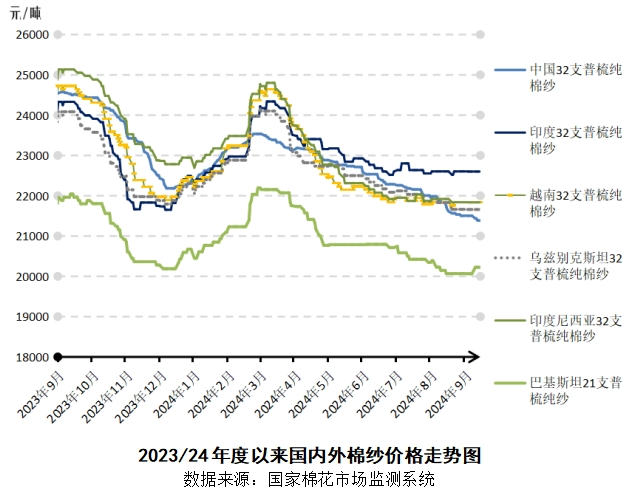 下游市场方面,纺织企业反映季节性订单回暖有限,“金九银十”旺季预期再次落空,终端采购意愿较前两周有所放缓,市场表现继续分化,大型纺织企业开机率偏高,产成品库存缓慢消化,小型企业接单仍然困难,资金周转状况依然较差。总体来看,新棉上市在即,籽棉收购价格预期较低,下游纺织需求不足,国内棉价或继续承压。