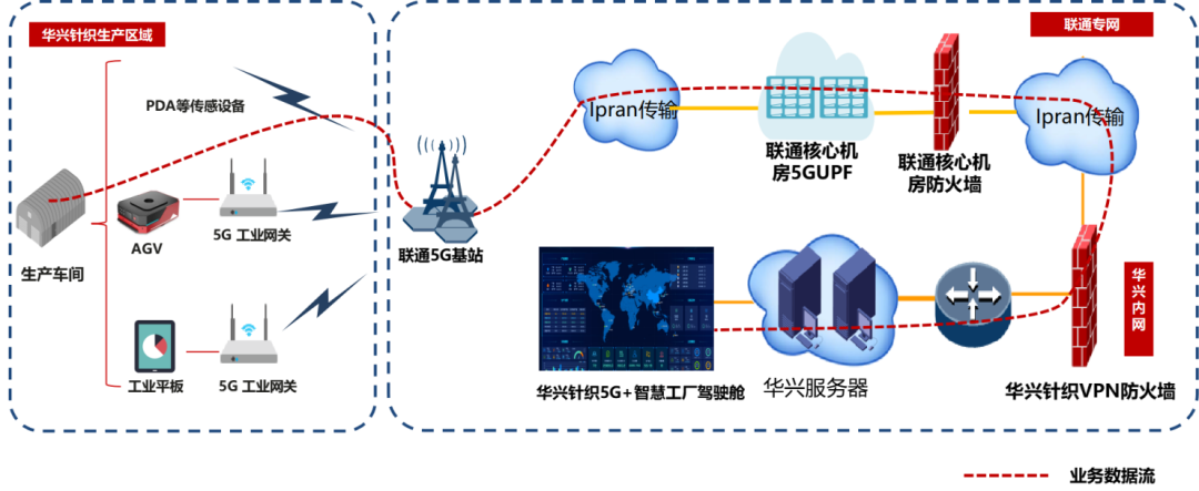 华兴针织5G智慧工厂项目通过5G公网专用模式搭建5G物联专网,提供高速安全的5G网络体验,降低ERP、MES、AGV业务数据时延,确保本地数据安全,助力企业提质、降本、增效。项目还开通并使用中国联通5G随行,实现生产人员、管理人员不换卡不换号便可随时随地访问外网/专网、企业内网,解决传统VPN体验差(需手工认证)、存在安全隐患等问题。