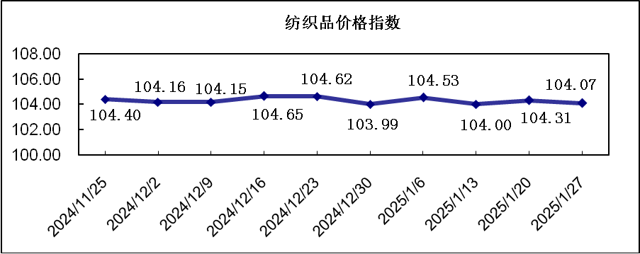 “中国·柯桥纺织指数” 20250127期纺织品价格指数收报于104.07点,环比下跌0.23%,较年初下跌0.44%,同比下跌1.25%。