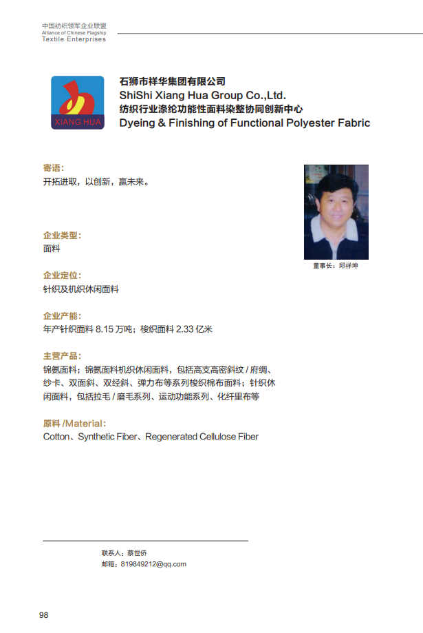 祥华集团创立于1991年,是一家集纺织、印染、服装和贸易为一体的综合型企业,战略规划明确,致力于打造智能化、绿色化、现代化的印染企业集团。