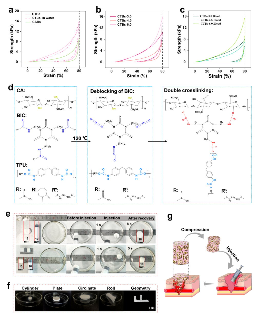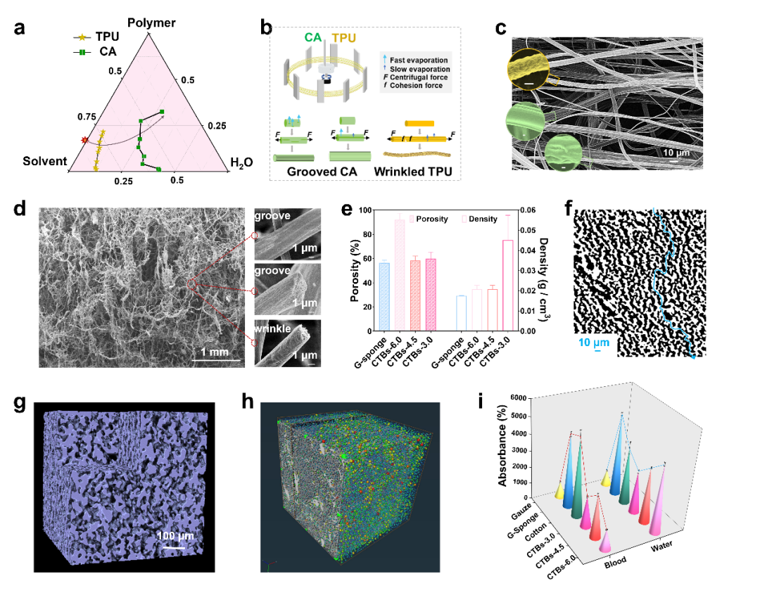 研究团队提出了一种双组分离心纺丝方法,利用双组分离心纺射流的相分离调控得到具有优异的血细胞粘附能力的沟槽状醋酸纤维素(CA)纤维和褶皱状热塑性聚氨酯(TPU)纤维。通过冷冻干燥技术制备了由封闭型水性异氰酸酯(BIC)双网络交联的高通孔(99.99%)止血气凝胶CTBs。