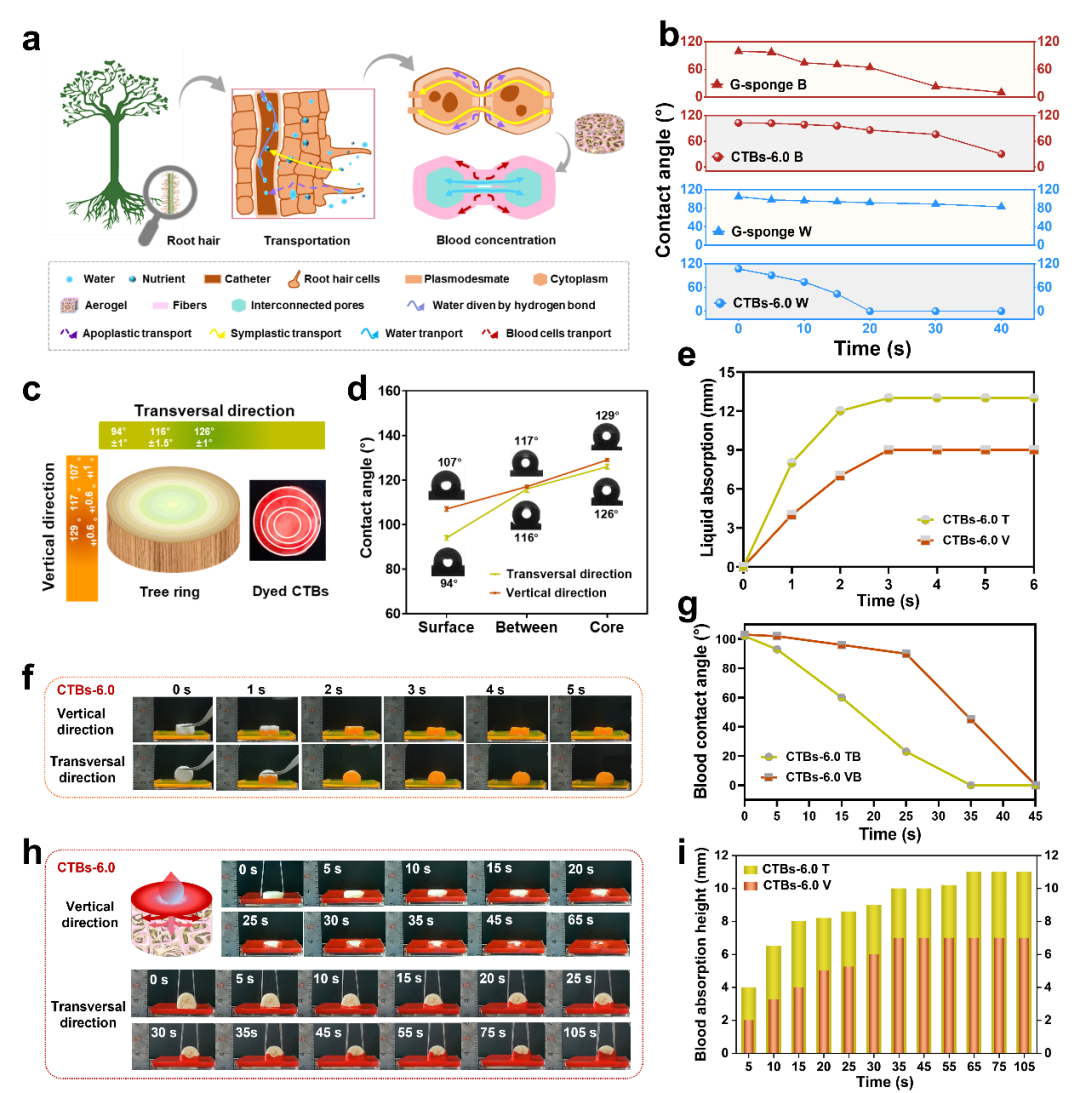 这种快速止血且低失血量的稳态气凝胶的设计灵感来自根毛的共质体运输和质外体运输:(i) 高度互连的孔和微通道,具有低流体动力学阻力,充当细胞质和胞间连丝,以确保水的快速吸收和运输;(ii)具有多级结构的纤维网络起质外体运输作用,促进血细胞聚集和粘附,实现快速凝血和减少失血。此外,为了增强分离效应,仿生树木年轮设计了不同方向的疏水梯度差,气凝胶核心比其表面更疏水,从而使得液体的垂直渗透慢于横向扩散。