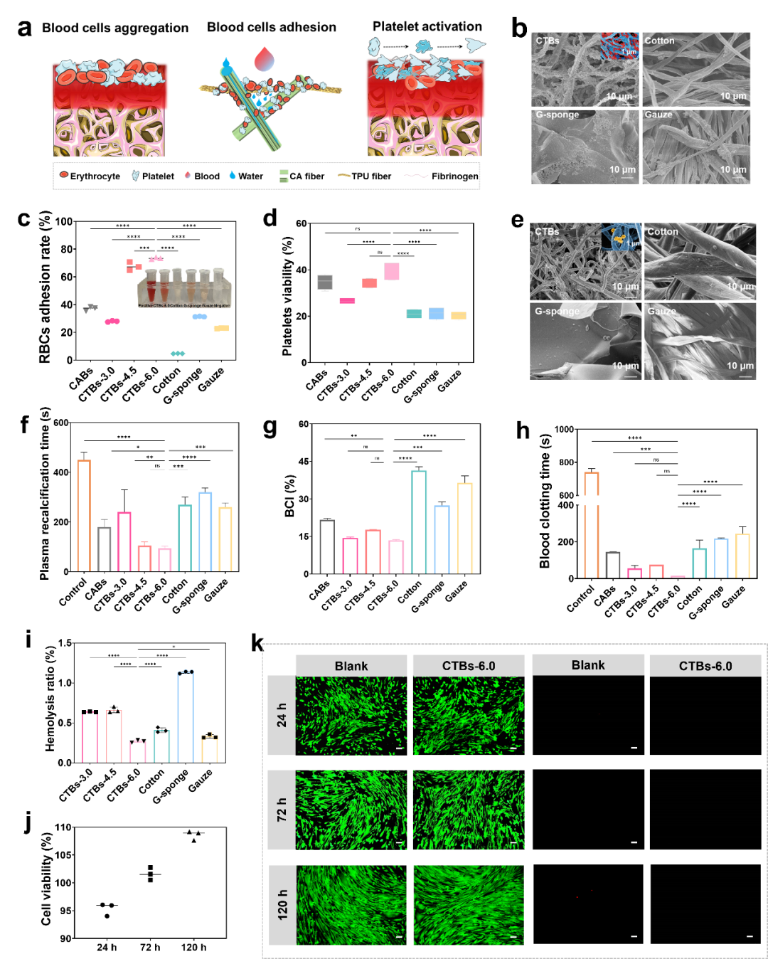 材料表征测试结果表明:CTBs具有高孔隙率 (91%)、优异的吸水性能(4147% ± 99%) 和所需的低吸血率(1210% ± 17%),且血液相容性(溶血率:0.01% ± 0.033%)极佳、无细胞毒性。由于纤维拓扑结构对血细胞的吸引和聚集、高孔隙率和高通孔率赋予的强吸水性能以及较小孔径(7~15 μm)和方向性液体运输加强的血细胞的铺展和血液浓缩效应,使得止血气凝胶CTBs表现出卓越的促凝血特性(体外凝血时间为15 s),此外,CTBs的形状回复特性使其在伤口部位产生适当的压力,形成凝血屏障以阻止血液流动,加之,材料上丰富的羧基与红细胞之间的相互作用可以激活内在凝血途径,进一步促进血液凝固。动物实验结果显示,同等条件下,相比其他商用止血材料,其止血时间缩短了近78%,失血量降低了近94%。可见,CTBs为创伤急救止血和凝血障碍治疗提供了有效解决思路。