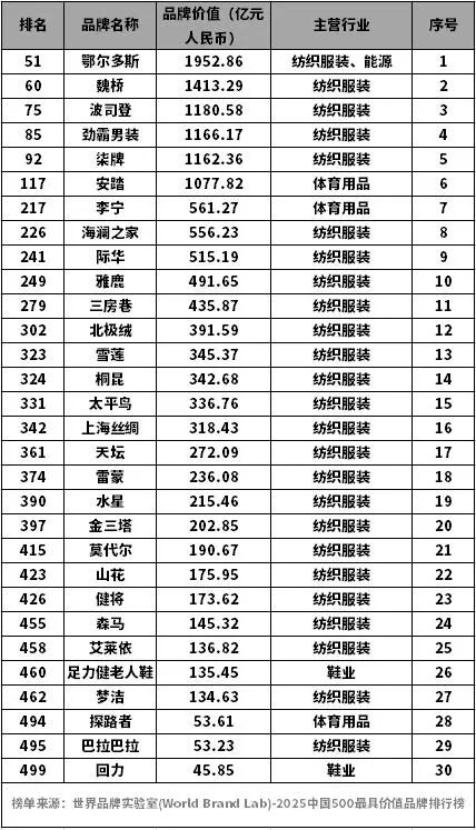 6月18日,第22届世界品牌大会在北京举行。主办方世界品牌实验室(World Brand  Lab)发布了2025年《中国500最具价值品牌》分析报告。品牌主营与纺织服装相关的共有30个品牌入选,其中鄂尔多斯、波司登领衔,安踏、李宁、劲霸、柒牌、海澜之家等品牌紧随其后。